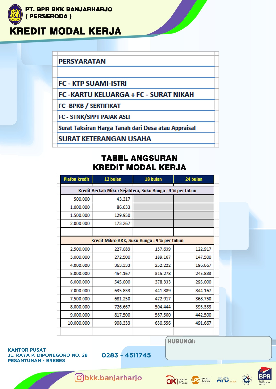 - Suku bunga antara 10,5 % s.d 24 % per tahun, plafond 100 juta keatas bunga 12 % pertahun dan plafond diatas 500 juta bunga 10,5%